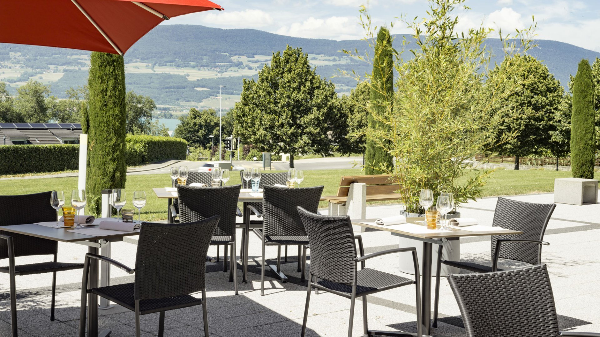 L'été, avec une vue sur le Jura, les convives peuvent profiter d'une belle terrasse fleurie élue parmi les plus belles de la région par l'office du tourisme Yverdon&lacs.